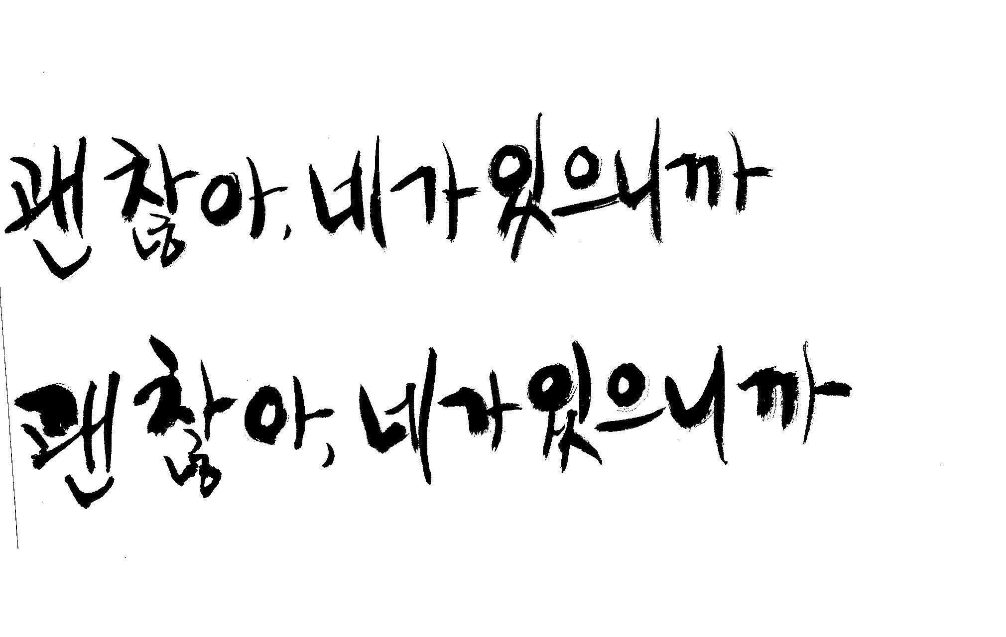 캘리 하나 부탁드릴께요. 김철호 일반 0 7031 2009.01.06 22:48 > > > > > 지금 작업중인 표지가있는데 > > > > 손글씨로 한번 작업해보려구요 > > > > 부탁드립니다. > > > > 괜 찮아, 네가 있으니까 > > >